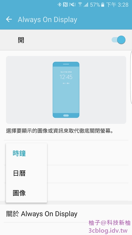 Always On Display 預設為開啟狀態,如果要設定或是停用,請到設定 >> 顯示底下的 Always On Display,顯示內容目前有時鐘、日曆與圖像三種,而且如果你換了主題,也會有主題背景喔~