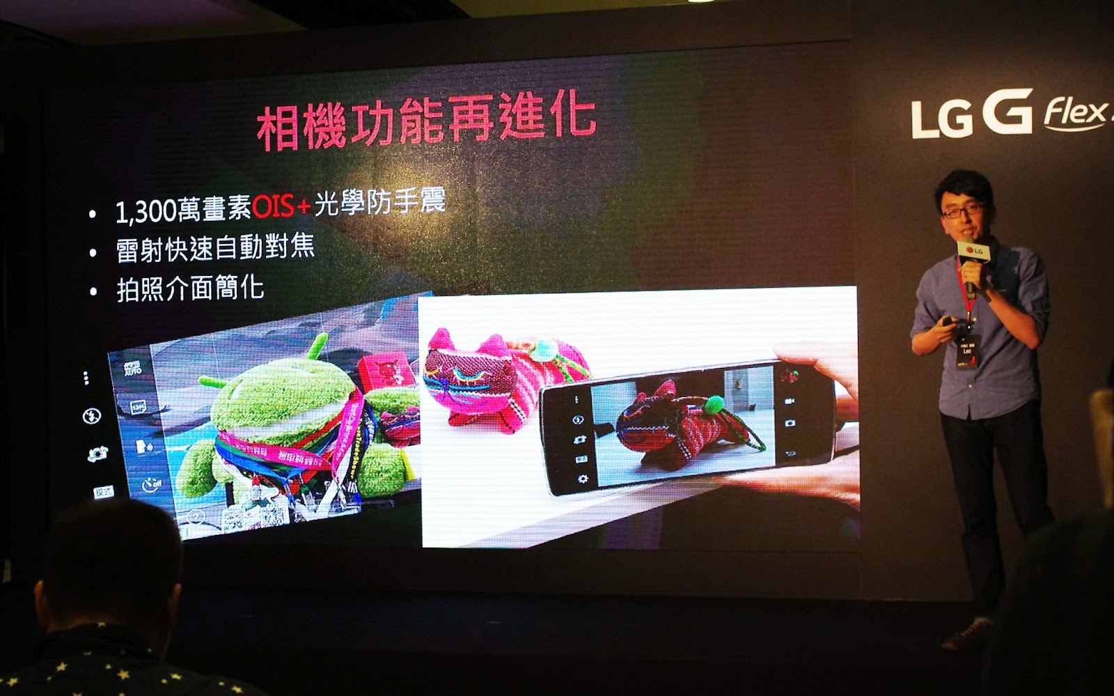 ▼ 由 LG 產品經理 Eason 的介紹,可以知道或許螢幕由 6 吋變成 5.5 吋,但是螢幕解析度大幅提升為 1080P ,相機也加入了 OIS 光學防手震,LG G Flex2 在硬體方面更是大幅的超越了前一代,可以看出 LG 對 G Flex2 的用心。