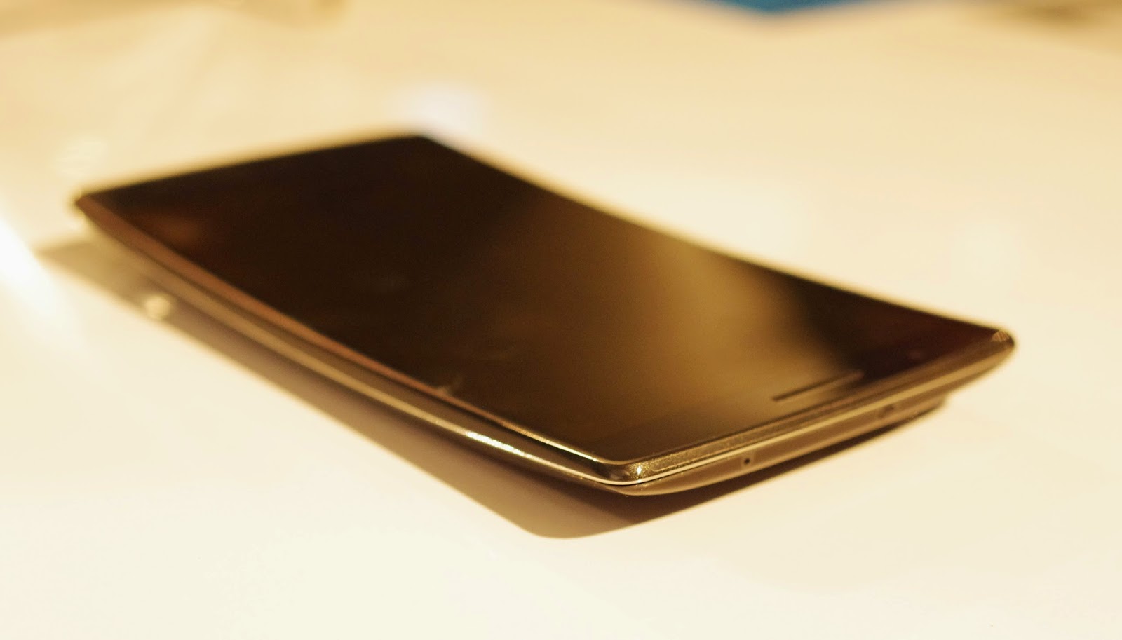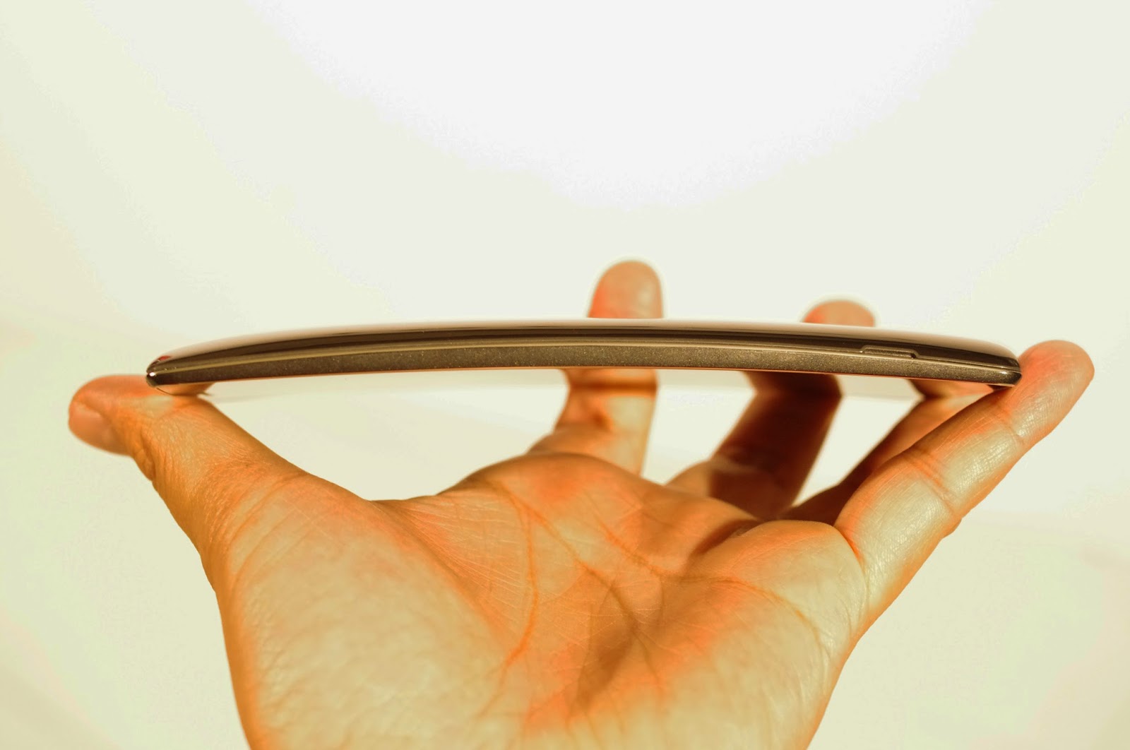 ▼ LG G Flex2 放在桌上由側面看就可以明顯看到螢幕的700R彎曲弧度。