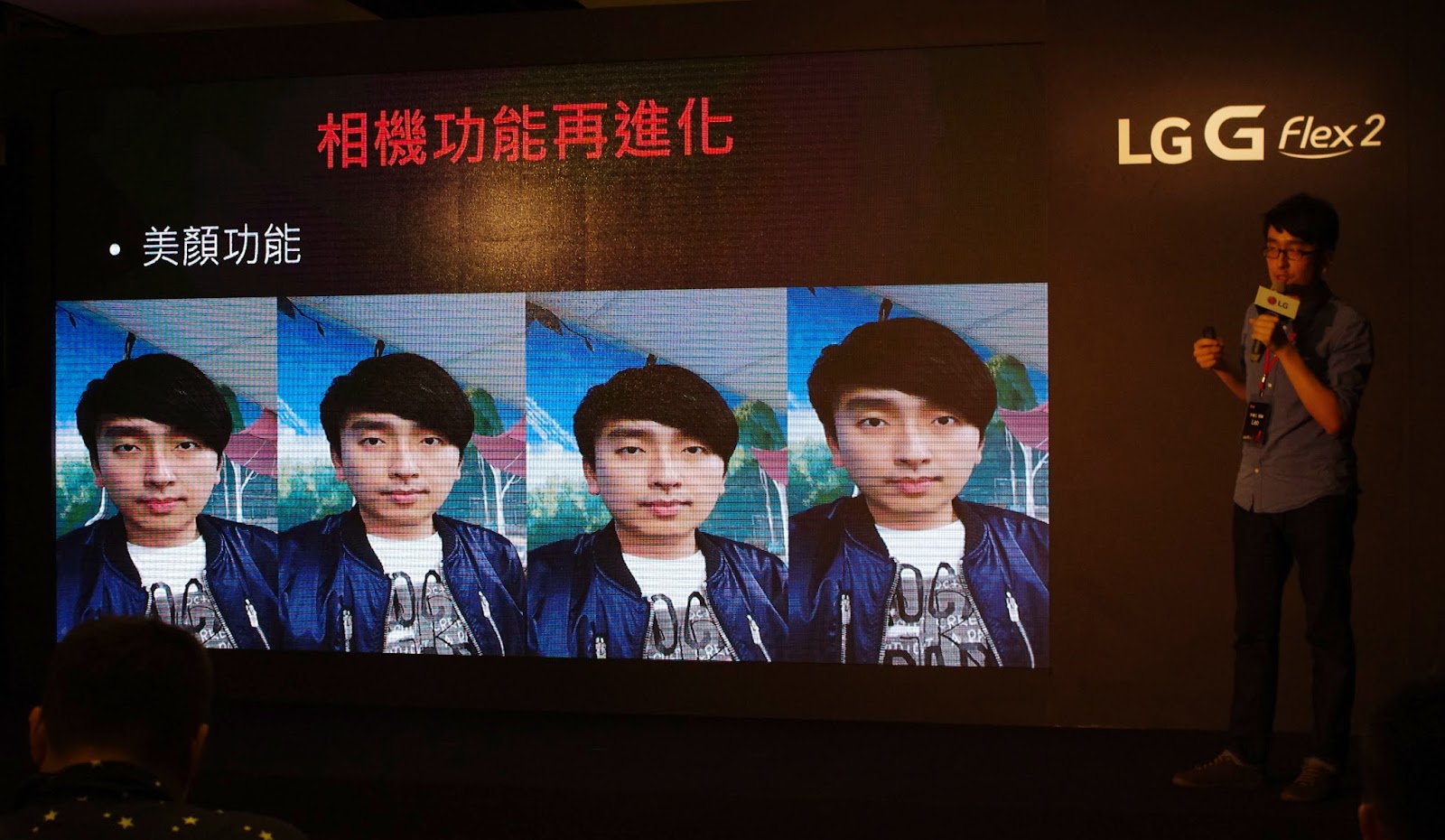 ▼ 自拍最棒的利器就是照片美顏功能,LG G Flex2 在這一功能上當然沒有缺席,SOGO 手機王 ~ 陳里歐總編輯清自示範了美顏功能的效果,可以看的出來美顏功能開到最高,人臉看起來幾乎是橡皮臉了,相信愛自拍的大家應該會非常的滿意。