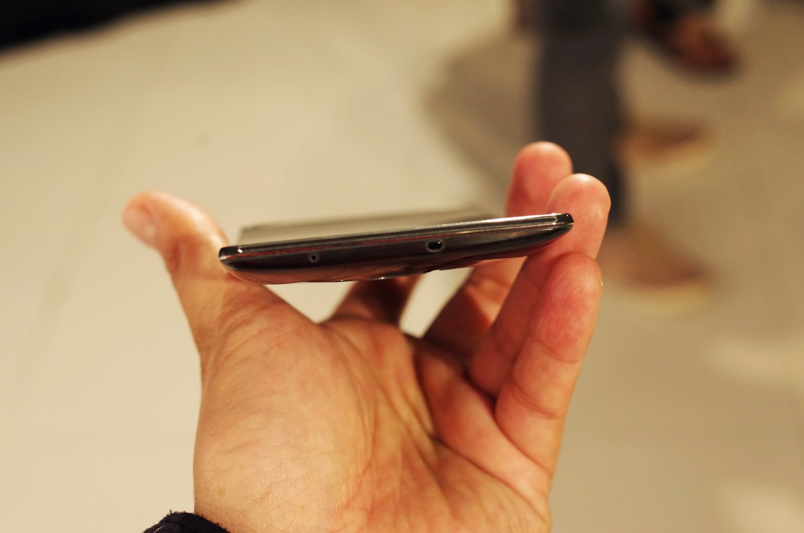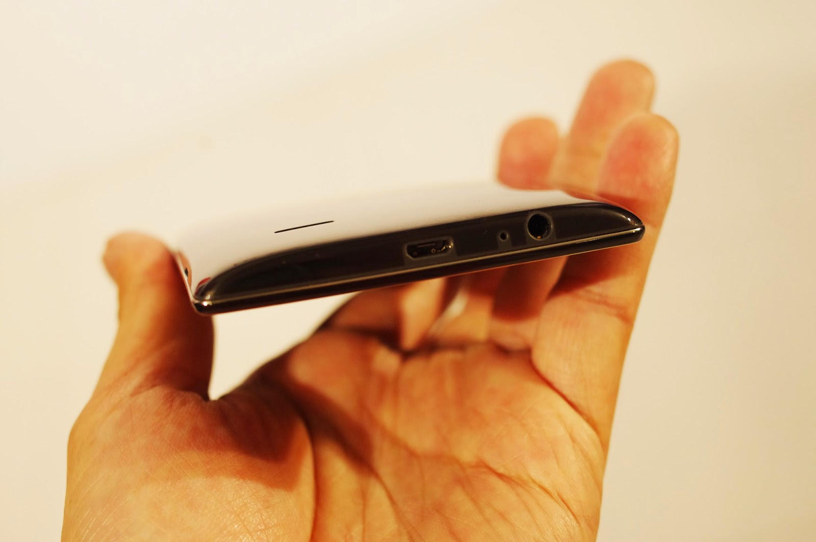 ▼ LG G Flex2 的機身底部有 3.5 mm 耳機孔、麥克風與 microUSB 2.0,照片中也可以看出 LG G Flex2 機底是有弧度的,由於機身微彎曲使得平放於桌面時鈴聲不會被悶著,官方資料可以知道彎曲弧度是 400R。